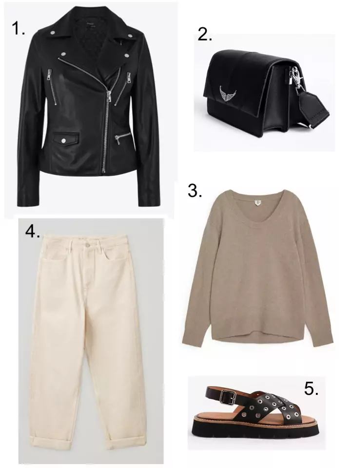 Finally, something for the more understated ladies out there. Pairing your black biker with neutrals is a very classy option for spring, I think. Keep your shoes and some of your accessories black to balance everything out. You can also wear with your white jeans for a more monochrome look, but we’ll get into that next week. Those white jeans from Whistles that I ordered last week are a winner, by the way, so I’m feeling inspired to find ways to wear them on days when I’m not around the dirty dog. By this I mean the actual dog, it’s not a pet name for the husband…