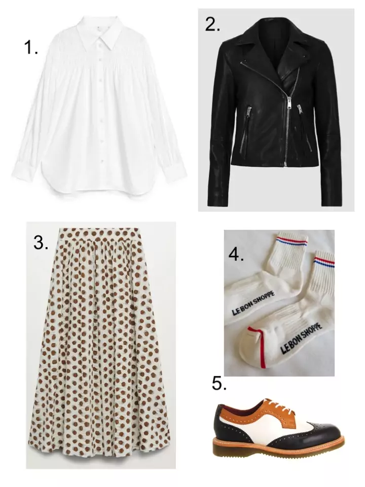 Talking of a high pony and a white shirt, why not try this with a midi skirt? This look is a little bit Sandy-from-Grease but for modern day. I always preferred what she looked like pre-transformation. I’m not sure any of us can pull off the skin tight disco pants, bouffant hair and stilettos anymore, but we can still team a biker with a circle skirt. I’m kind of into wearing socks with shoes right now. I fear a blister at the best of times and socks really do get around that problem. My current favourite socks are these from Le Bon Shoppe.