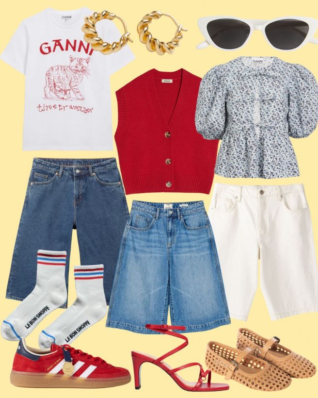 Have you got yourself a pair of long denim shorts? Or ‘jorts’, if you will. I know they won’t necessarily be a crowd pleaser, but I have been enjoying this longer length being a trend. Think of them as short jeans if you’re scared of shorts. You don’t even need to part with any money to have a pair: the ones I’ve been wearing the most I made myself by just hacking a bit off an old pair of jeans. If you’re going to do this, you need to make sure the jeans you modify are of the wide leg variety. This look won’t work with a slim fit – you’d be veering deep into pedal-pusher territory and, despite that being à la mode this summer with the serious fashionistas, it’s not one I wish to partake in.