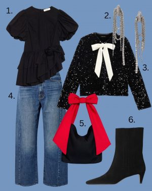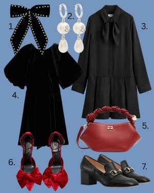 Let’s start with this, because it’s a failsafe classic option and I do feel that everyone should have a comfortable and wearable LBD in their wardrobe. So I’m talking nothing tight here, just a simple yet smart dress you can throw on, add some shiny accessories and be off to the event without a care. I do like a bow in this instance, be it in your hair, on your feet or (in the case of this cute dress from H&M) on your back.
