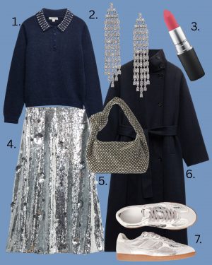This is one of my favourites. Make the trophy skirt the main focal point of your party outfit while keeping the rest of it fairly simple, and if you want to wear trainers, of course you can. You can keep the comfort factor but up the bling by picking a bolder metallic pair instead of your usual scruffy Sambas. Side note: This lipstick is the perfect evening bright lip — like a cross between pink and red, bright but not too bright and very flattering.