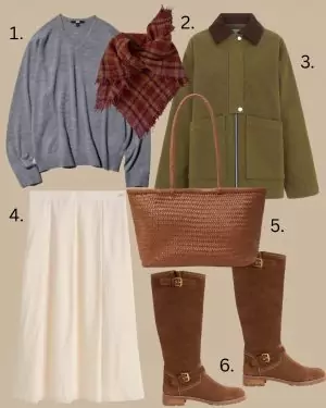We’re all trying to make our wardrobes work harder, so here’s an idea to take your cream summer skirt into the autumn months. Add an oversized grey jumper (Uniqlo men’s department does the best value and quality for this, in my opinion) and a pair of knee-high boots.