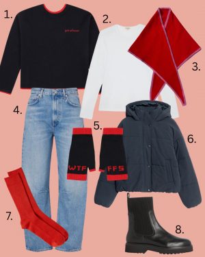 This is, of course, a shameless plug for my collaboration with Black & Beech. There are still a few of my reversible merino wool jumpers left, but once they’re gone, they’re gone. They’re made for layering over a classic white T‑shirt, which is exactly how I’ll be wearing mine. I’ll throw it on with my trusty football puffer, a layer (or three) of thermals, and of course, a few red accessories for good measure.