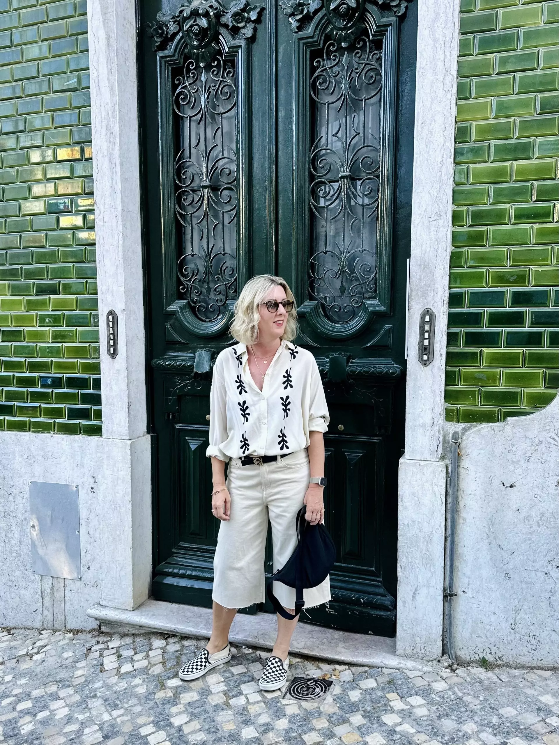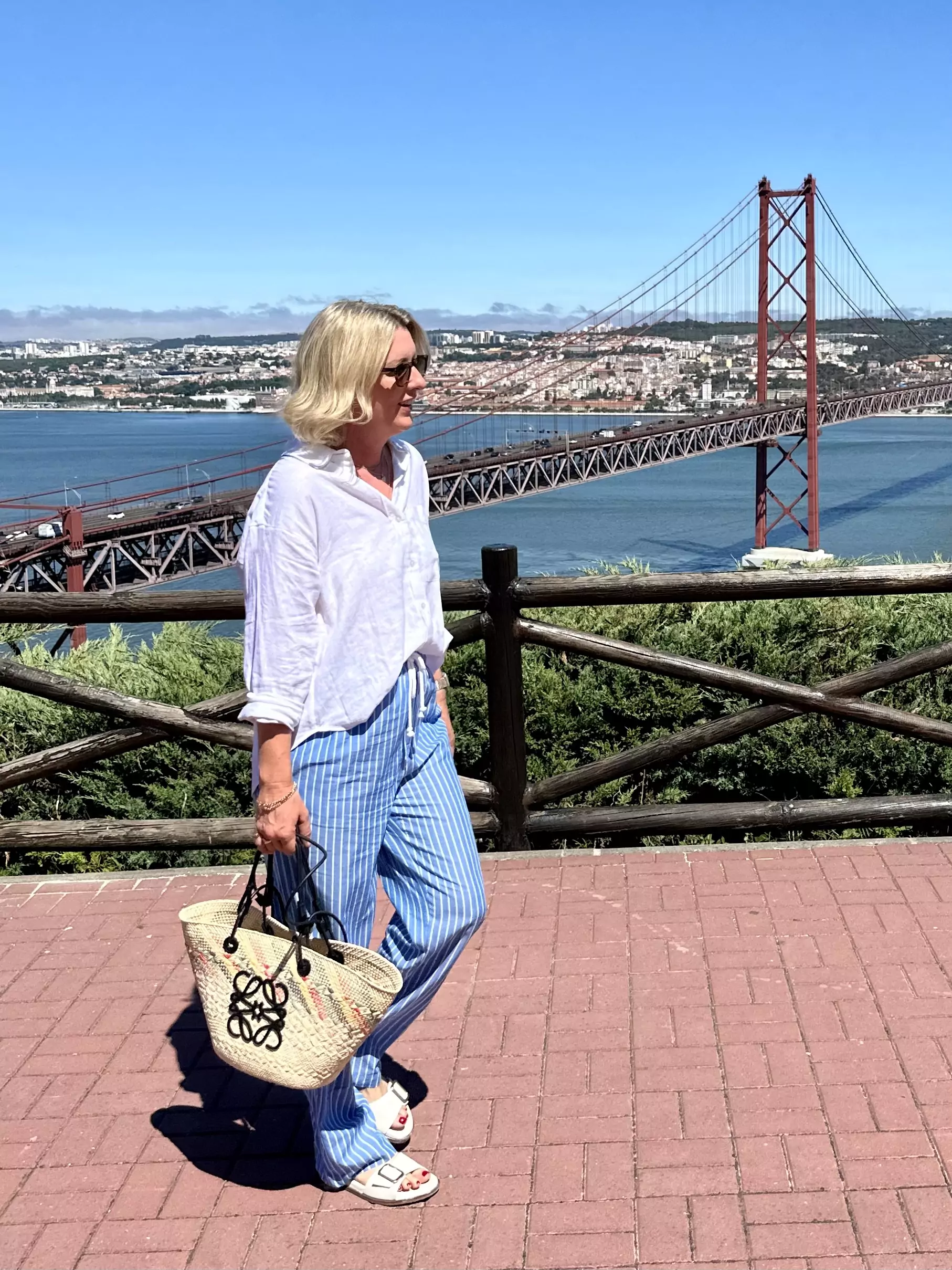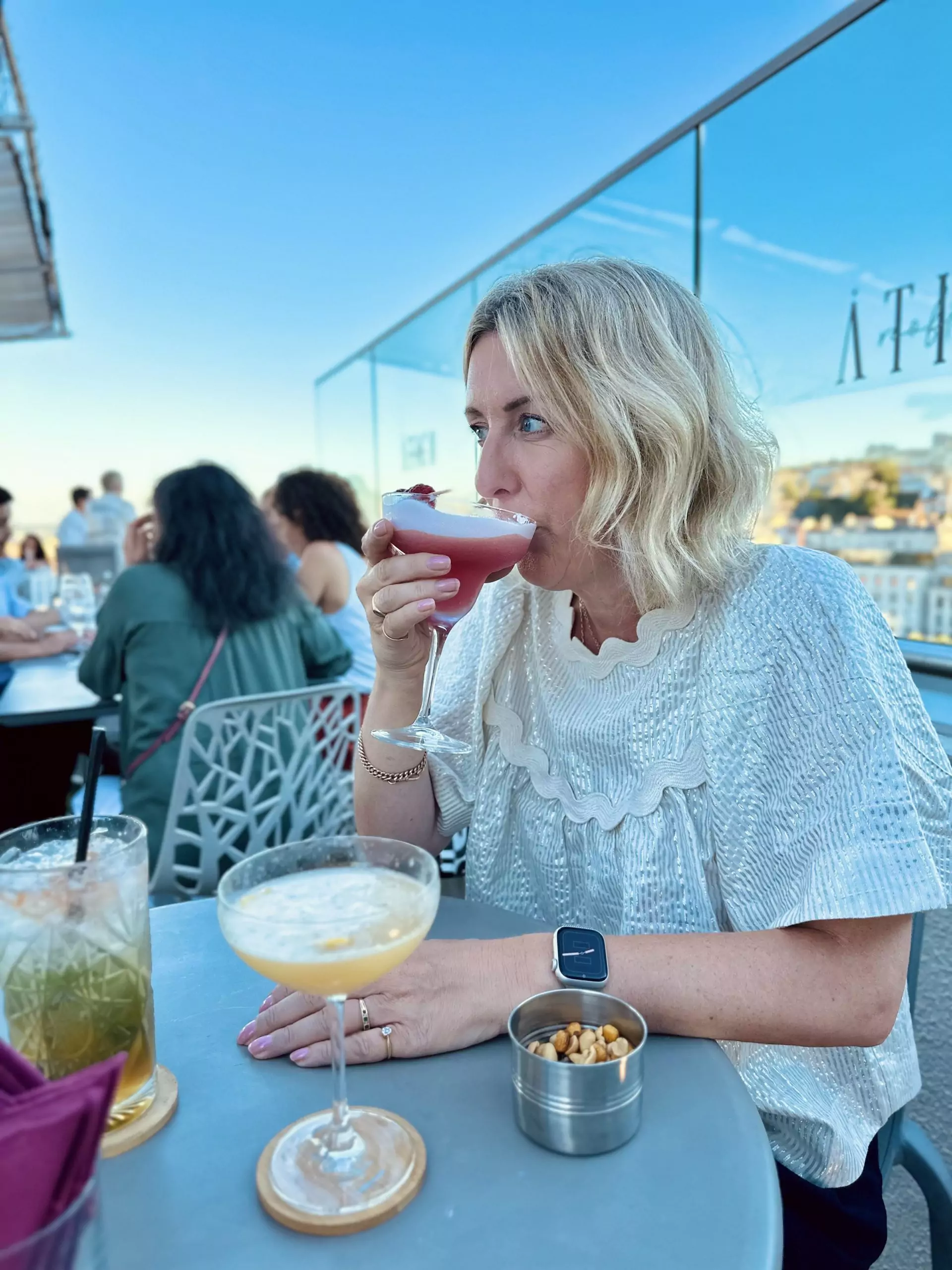 There are a lot of rooftop bars in Lisbon, the one right next to our hotel called Seen was the most bougie, but the cocktail prices were very steep, so we plumped for the Atico rooftop bar on top of the NH Hotel over the road as their drinks were half the price and the views were excellent. I got to wear my shimmery top from 46 Stitch that a lots of you loved, I don’t have these gold sandals, I’m using artistic license here, but I do have them in cream and in black and they are SO comfortable. you can wear them all day and all night.