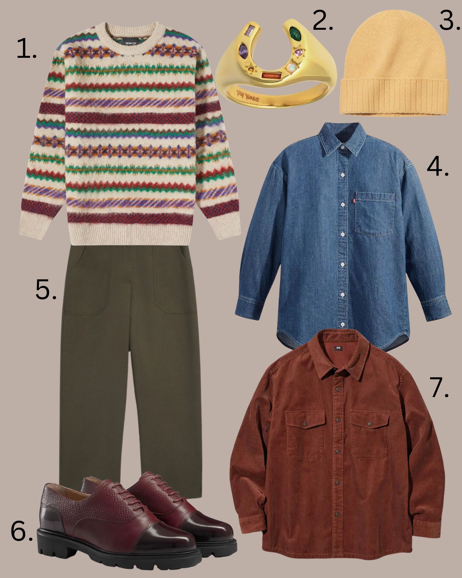 We had to include some Fair Isle knits here. If it’s good enough for Claudia, then it’s good enough for us. A classic denim shirt, khaki trousers, corduroy and brogues: a very easy look to replicate. Add some manly jewellery to top it off. I veer very much towards vintage jewellery these days. This highlight on my Instagram has some of my favourites in it, but I’m not averse to some cheaper costume pieces every so often. Latest purchase is this horseshoe ring from Junk Jewels; I love it.