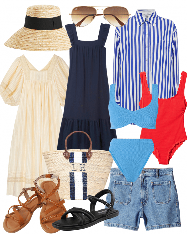 • 2 x BAGS: One large tote for the plane and the beach – I’d go for a basket bag. And one small cross body for sightseeing and evening.