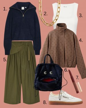 Let’s start off with a very safe colour combination. This one’s for those who don’t want to be too showy. I’m a firm believer that a good pair of khaki-green trousers is a spring/summer wardrobe staple. They go with so many other colours, but work just as well paired with a white T‑shirt and a navy jumper. I’ve been coveting this Varley half-zip for while now, and found it last week for 50% off here. Happy to report it lived up to my expectations.