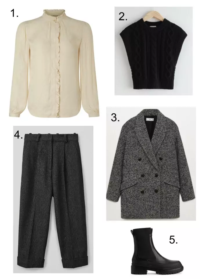 I couldn’t leave without this look. Princess Diana pretty much single-handedly invented the Sloane Ranger look. Pie Crust collar, Navy Tank Top, A line skirt. Loafers. Modernise this look by adding a cooler sweater vest, chunky boots and excellent pair of wool trousers. I’ve got these ones from Cos in my virtual basket just waiting and hoping that they go in some kind of Black Friday sale soon. Talking of Black Friday, I might still do my regular annual post with all the relevant discounts and codes on it if I get the time this week. Although a lot have started already. Let me know if that’s useful and I’ll get on it. If you’re a subscriber to my email, I will aim to get it to you on Thursday afternoon.