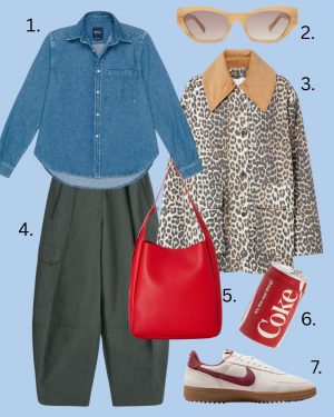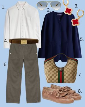 A crisp white shirt and a pair of khaki trousers never ever goes out of style. I usually tuck in my shirts to give me some shape, but recently I’ve been going with an oversized white shirt worn with a blazer, and I’m enjoying the freedom. Some days you just don’t care if you have any shape at all, and that’s absolutely fine.