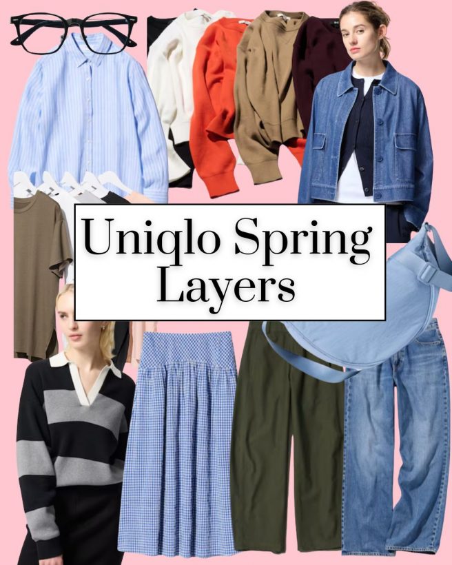 This month I am focusing on layers. I tend to start with an Airism T‑shirt, layer it under a great polo-style sweater add some wide-leg jeans, and finish with a windproof jacket (which has a hidden hood) that is perfect for spring wind and showers