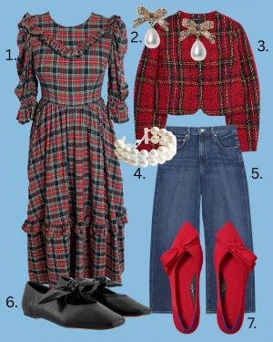 If tartan is the pattern, then red is the colour. Especially when paired with bows, pearls and fancy flats. I had a message from a reader this week asking what one should wear in a ‘no shoes’ household at Christmas. I would suggest pleading with your host to let you put on some nice clean ‘indoor’ flats, because an old sheepskin slipper just doesn’t cut it when you’ve got your best frock on.