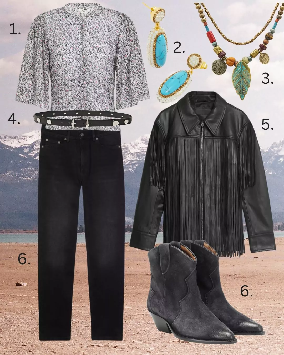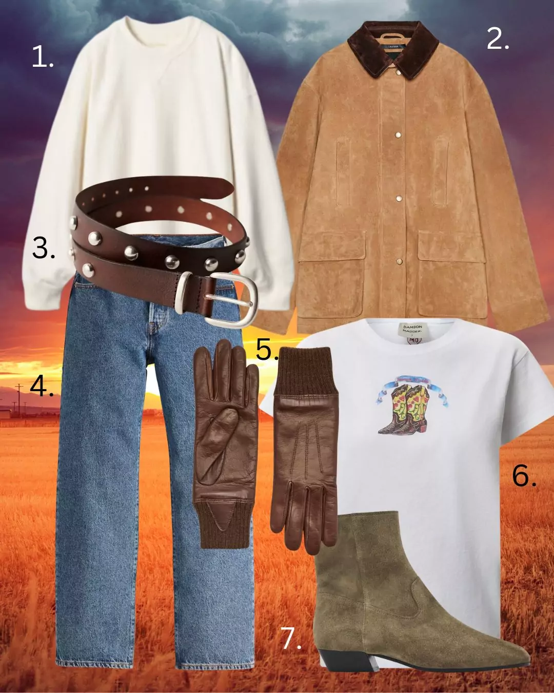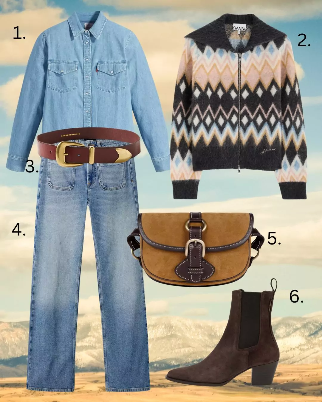 Double denim for the win down on the ranch. Go for the classic Levi’s western-style shirt that has been around since the 1950s and barely changed since. They still sell it so you know you’re buying something timeless. Even better if you can find a vintage shirt that’s already got that worn-in softness. Beth wears her double denim with a statement jacket and belt.