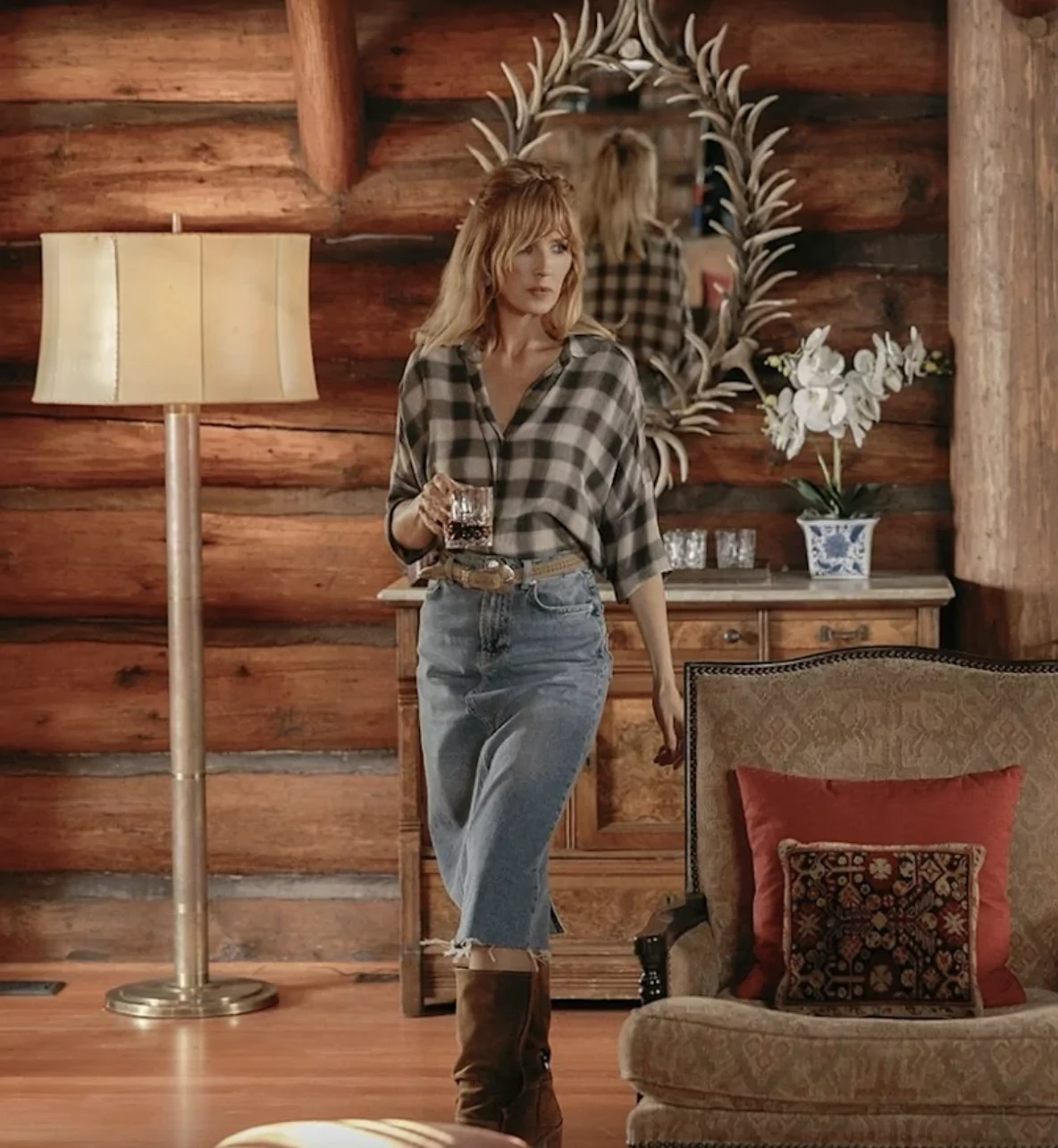 This, I would say, is the Beth Dutton signature look. A girly dress, but always, always worn with boots. She’s no ballet pumps or trainers girl, our Beth. At any given point she might need to saddle up and get going, so she’s always in her boots. They also make these dresses look dressy, if you know what I mean. I’m going to have to dig out those cowboy boots I felt I HAD to buy when I was in Dallas in 2023, aren’t I?
