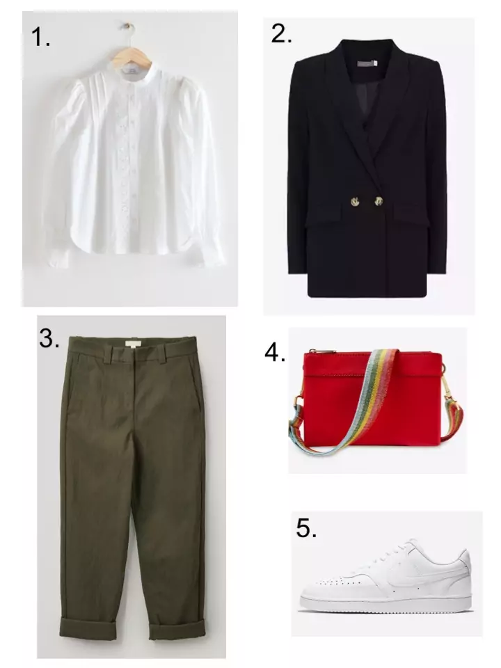 The white blouse, navy blazer, khaki trouser, white trainer combo. It says, ‘I’m kind of smart, I’m looking profesh, yet also a bit girly but I can still walk long (social) distances in my comfortable trainers’. The colourful bag is quite often the key to making a basic outfit just that bit more interesting, which is why I think it’s worth investing in a good one that will last. See also shoes. As I’ve always said, spend your money on good bags or shoes, because you’ll never get too old or too fat for them. I realise I’m probably not supposed to even use the words old or fat these days, but sometimes it’s the only way.