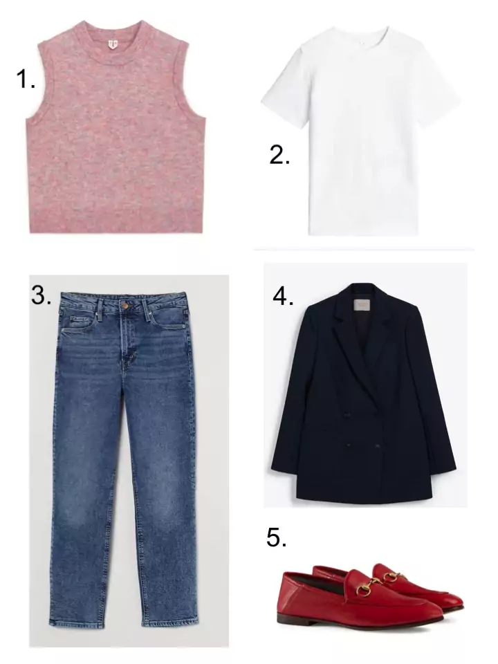 Finally, the white T‑shirt, tank top, jeans and navy blazer combo. Add your best shoes for the full effect. I’ve mentioned the Gucci loafers many times before. A HUGE investment purchase I grant you, but will never ever date. They’ve been making them since the dawn of fashion time so you know they are never going to go out of style. Super comfortable. I’ve had mine since 2016 and they’ve never given me a day of trouble. Cost per wear so far, I’m looking at around £15. That would have gone down considerably had we actually been able to leave the house over the past year. Check out the ‘Shoes that aren’t trainers’ blog for alternatives at other price points.
