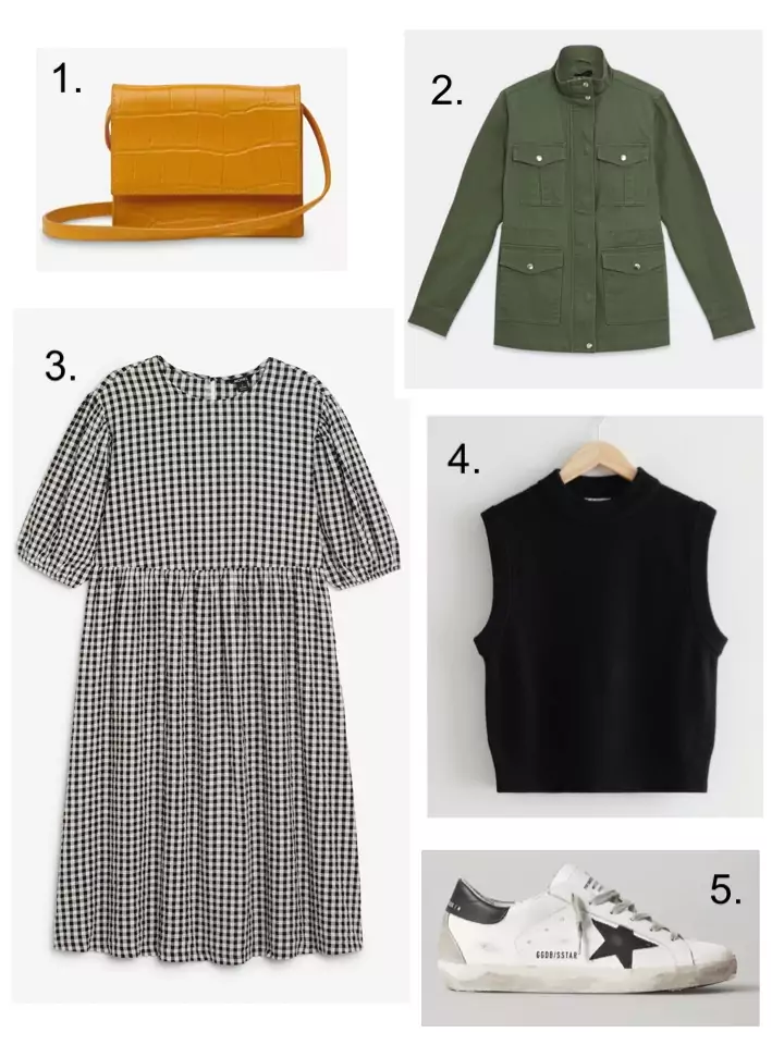 The gingham dress, tank top, khaki jacket and trainers. I’d say the tank top/sweater vest/whatever you want to call it is THE fresh new addition to your wardrobe for 2021. I’ve obviously fully bought into this trend. I don’t know why I never thought of it before. It’s the perfect way to get more use out of your summer dresses when the weather is not quite warm enough. On the flipside, a tank top works perfectly with spring jackets as there’s no bulky sweater arms to squeeze into the sleeves. It also frees the armpits for anyone in a peri/menopausal state. If you know, you know…